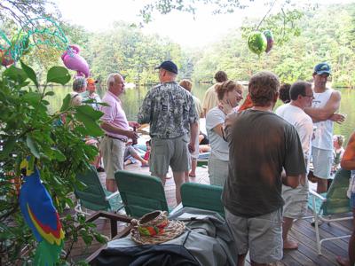 | Residents of Taunton Lake socialize on a neighbor's dock during the Flotilla of Fun. | Organizers Paul and Shirley Martin (in paddleboat at left) join other residents visiting various host docks during this year's Flotilla of Fun. |
